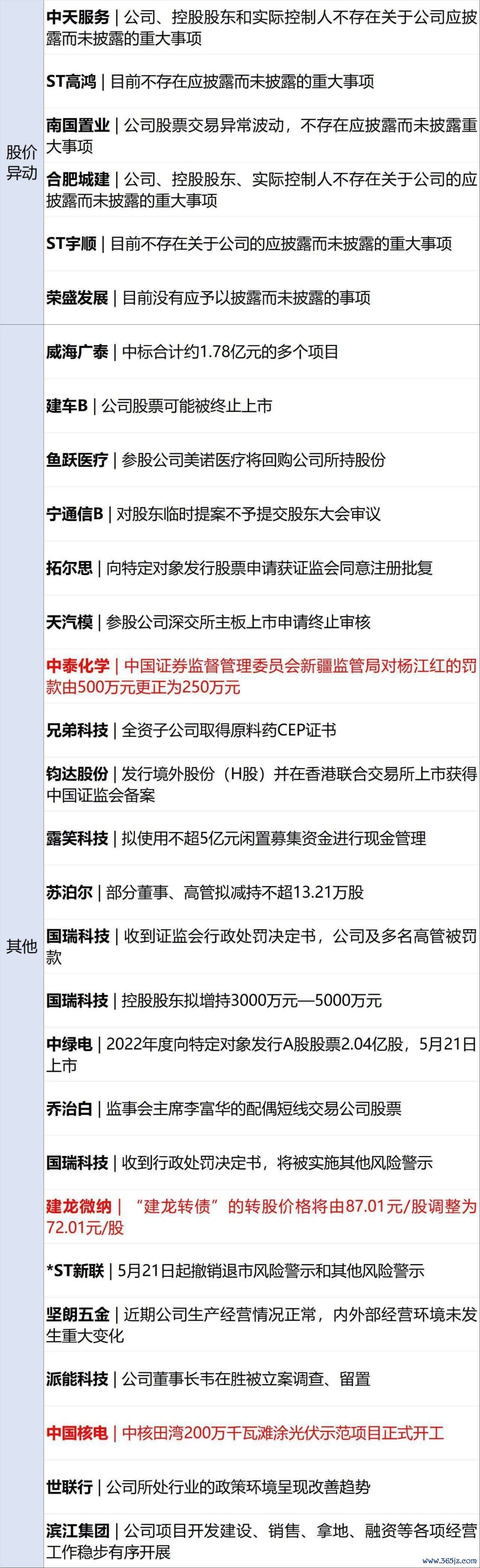 中泰化学(002092,股价:4.93元,市值:127.6亿元):5月19日晚间,中泰化学发布公告称,公司及相关责任人收到新疆证监局出具的《行政处罚决定书》。经查明,中泰化学2022年年报中存在虚假记载;2022年合计虚增收入42.48亿元、虚增成本42.48亿元;未及时披露控股股东及其关联方非经营性资金占用的关联交易,涉及金额超77亿元等。新疆证监局决定对公司责令改正,给予警告,并处以500万元罚款;对相关当事人给予警告并处以数额不等的罚款。公司股票将于5月20日停牌一天,5月21日开市起复牌并被实施其他风险警示。