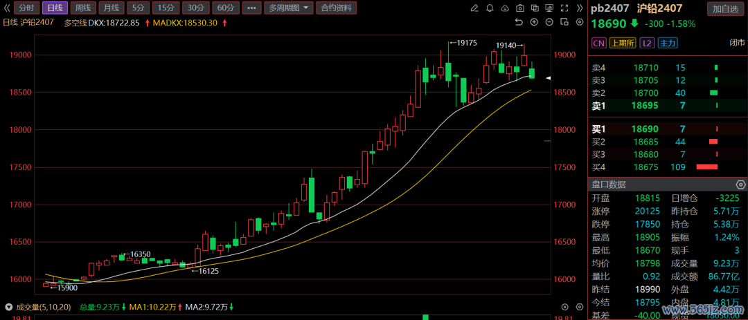 虽然6月5日,沪铅主力合约2407报跌,但截至收盘依然录得18690元/吨,较两月前约16400元/吨的价格上涨近14%。