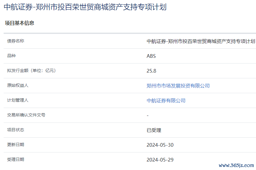 【大河财立方消息】5月30日开户配资平台,中航证券-郑州市投百荣世贸商城资产支持专项计划获上交所受理。