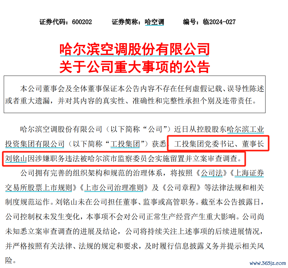 哈空调(600202)6月3日晚间公告,公司近日从控股股东哈尔滨工业投资集团有限公司(以下简称“工投集团”)获悉,工投集团党委书记、董事长刘铭山因涉嫌职务违法被哈尔滨市监察委员会实施留置并立案审查调查。