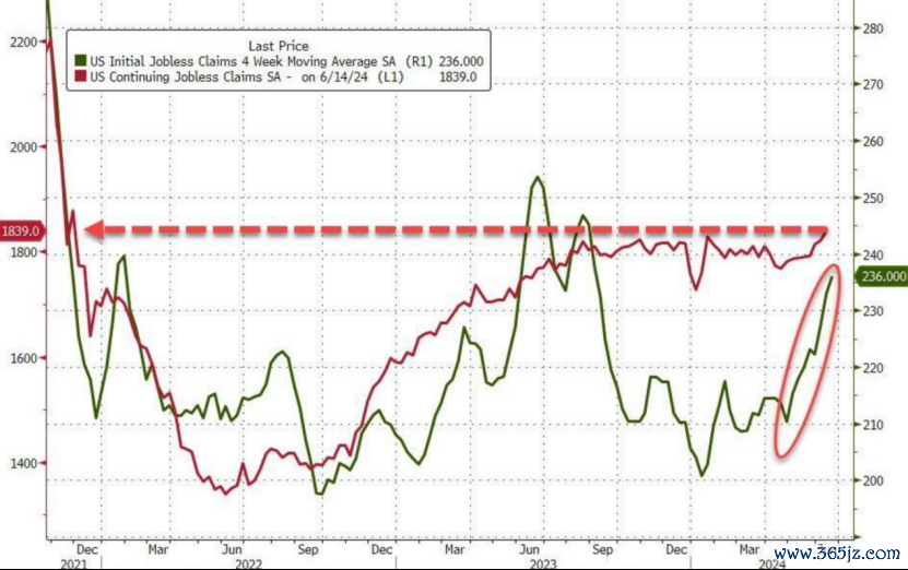 数据显示,美国6月15日当周续请失业救济人数183.9万人,超过预期的182.8万人,前值182.8万人,为2021年底以来的最高水平。这表明,失业者要花更长的时间才能找到工作,对美国经济而言并不是一个积极的信号。