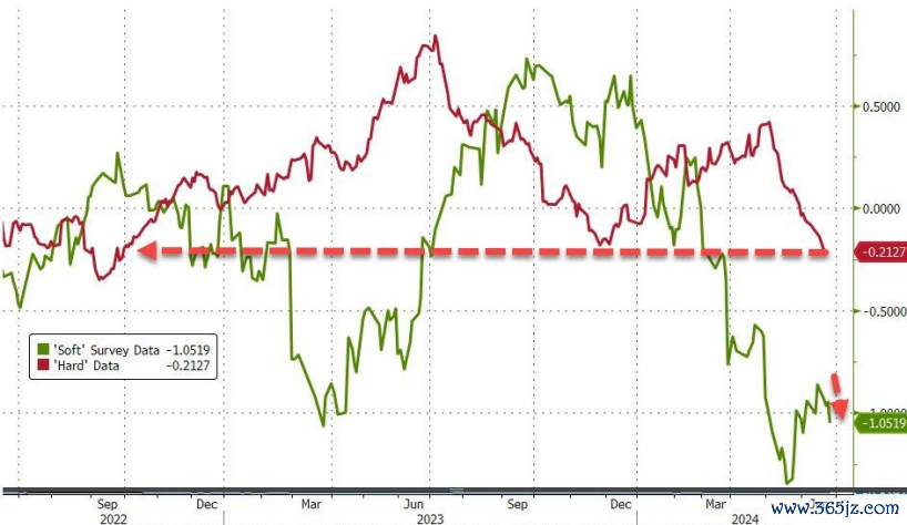 目前,美国宏观层面的经济数据中,无论是“硬数据”还是“软数据”都在下行。其中,“硬数据”更是已经下探至21个月的低点。