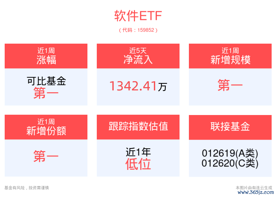 资金流入方面,拉长时间看,软件ETF近5个交易日内,合计“吸金”1342.41万元。规模方面,软件ETF近1周规模增长2973.37万元,实现显著增长。