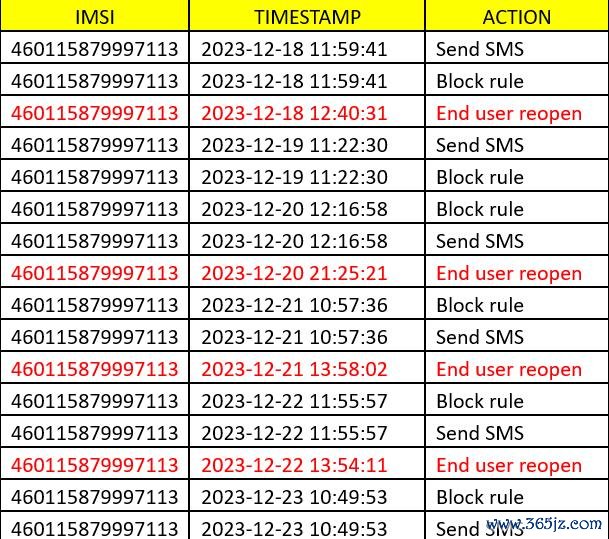 上海市通信管理局调查后了解到,12月18日—23日,用户王某某所产生的的漫游资费均达到熔断标准,因此中国电信的企业系统自动触发熔断,暂停用户数据漫游功能,并向用户下发提醒短信。但用户本人分别于12月18日、20日、21日和22日熔断后,自主恢复数据漫游功能。(详见下图)